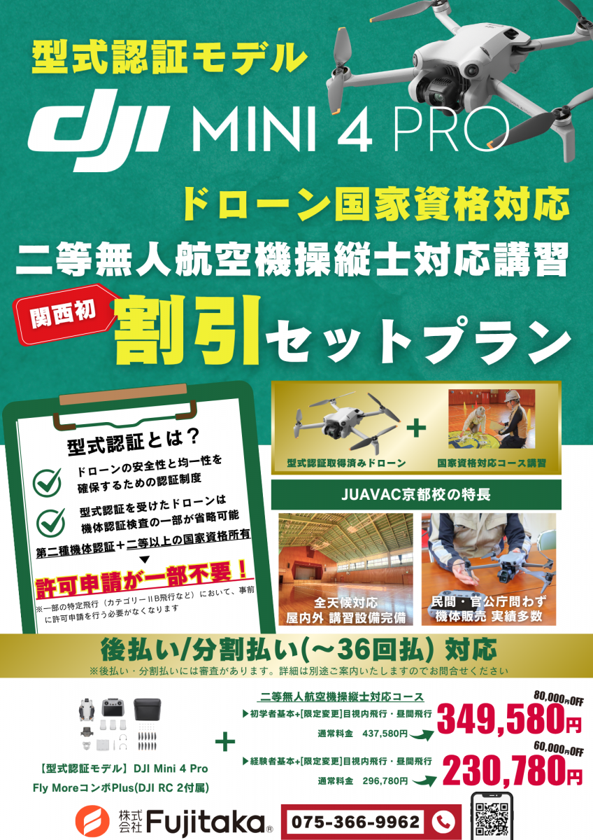 JUAVAC京都校は、小型カメラドローン「DJI Mini4 Pro」と二等無人航空機操縦士対応コース